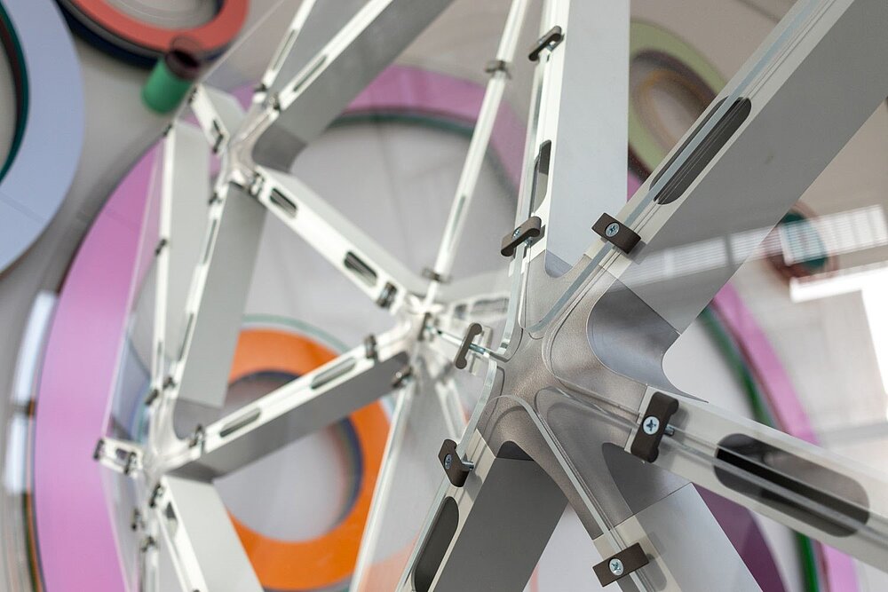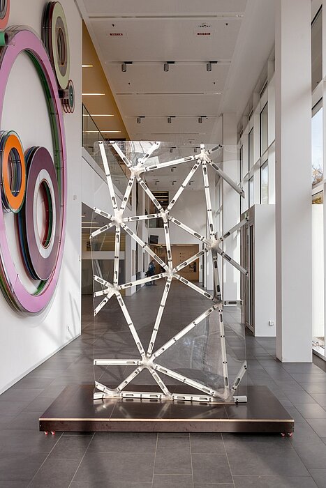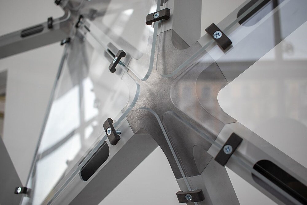 Die Forschungsgruppe FLEX präsentiert zum "Tag der Nachwuchsforschung" an der HTWK Leipzig im Foyer des Nieper-Baus den Prototyp einer Fassadenkonstruktion auf Basis des Konstruktionskonzepts ParaKnot3D. In der "Individual Node Facade (InNoFa)" verbinden 13 geometrisch und topologisch individuelle Verbindungsknoten Stäbe aus Hohlprofilen mit unterschiedlicher Länge, an denen wiederum Verglasungselemente mit individuellem Zuschnitt befestigt sind, Die Knoten wurden beim Projektpartner "Laserinstitut Hochschule Mittweida (LHM)" im SLM-Verfahren (Selective Laser Melting) aus Aluminium-Pulver gefertigt. Das Innovationsprojekt zielt darauf ein additives Fertigungsverfahren für großvolumige Bauteile aus Stahl zu entwickeln (Part LHM), welches auf Basis eines parametrischen Preprocessing-Konzepts (Part HTWK/FLEX) arbeitet und deutlich zeit- und kosteneffizienter ist als herkömmliche Verfahren.