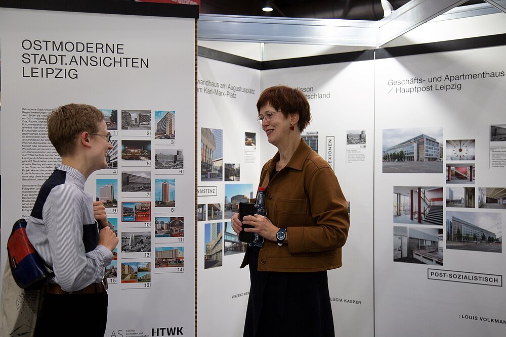 „Ostmoderne Stadt.Ansichten Leipzig“, eine Architekturausstellung der HTWK Leipzig, ist am Stand der Abteilung Denkmalpflege der Stadt Leipzig zu sehen. Prof. Dr. Annette Menting, Professorin für Architekturgeschichte, kuratierte die Gegenüberstellungen von Ansichtskarten aus den 1960er bis 1980erJahren mit aktuellen Fotografien von Louis Volkmann und von Architekturstudierenden der HTWK Leipzig. Sie zeigen Orte, Räume, Architekturen und Momente des Stadtlebens. Die Arbeiten schließen an das Instagram-Projekt „karten.der.moderne“ des Fotografen Louis Volkmann an und sind in Halle 2, Stand K 42, zu sehen. Täglich 11 Uhr laden die Abteilung Denkmalpflege, der Architektur-Studiengang der HTWK Leipzig sowie die Leipziger Denkmalstiftung zu geführten Ausstellungsrundgängen ein.