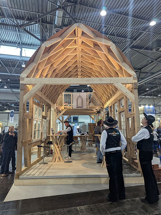 Die HTWK-Forschungsgruppe FLEX um Prof. Dr. Alexander Stahr zeigt am Gemeinschaftsstand mit dem Bauunternehmen Bennert einen zweigeschossigen Pavillon, dessen Dach auf der Konstruktionsidee von Friedrich Zollinger basiert. Die Forschenden interpretierten das Dachkonzept in mehrjähriger Forschungsarbeit neu und gestalteten daraus mittels moderner Technologie in Daten- und Holzverarbeitung eine Spitztonne. Zu sehen ist das Exponat in Halle 2, Stand K 20. Den neuesten Meilenstein der Forschungsgruppe – das im August 2024 eröffnete HolzBauForschungsZentrum Leipzig – stellt Stahr am 7. November ab 10:30 Uhr im Vortrag beim denkmal-Forum vor.