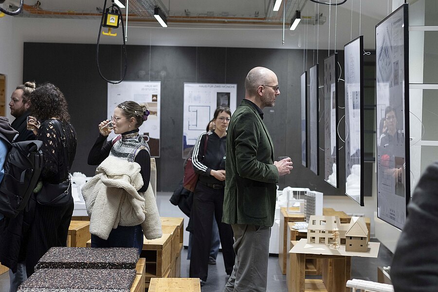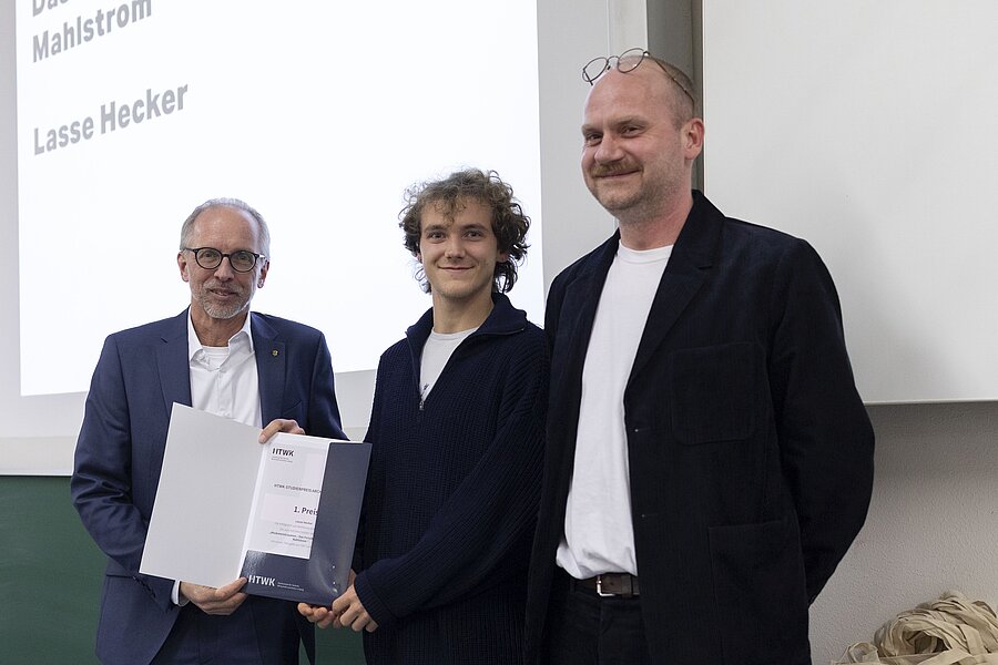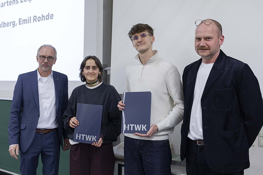 Im vollbesetzten Hörsaal wurden am Mittwochabend die Auszeichnungen bekannt gegeben und die Preise und Anerkennungen feierlich verliehen. Die drei prämierten Arbeiten sind ein naturnaher Bildungsort im Schulbiologischen Garten Leipzigs, ein skulpturales Forschungszentrum in einer maritimen Landschaft und eine dezidiert-provokante Auseinandersetzung mit der Bodenfrage. Darüber hinaus wurden drei Anerkennungen verliehen für ein Badehaus, eine Ostmoderne-Chemnitz-Erkundung und eine Quartierentwicklung in Halle. Den wertschätzenden Laudationes von Prof. Max Wasserkampf folgten die Überreichungen der Urkunden gemeinsam mit Andreas Wohlfarth. Die Vernissage zum HTWK-Studienpreis Architektur 2026 fand anschließend im Creative Club der Architekturetage statt, bei der alle eingereichten Arbeiten präsentiert wurden. Der Austausch über das anspruchsvoll-vielfältige Spektrum der Studienarbeiten konnte bei einem Empfang weitergeführt werden.