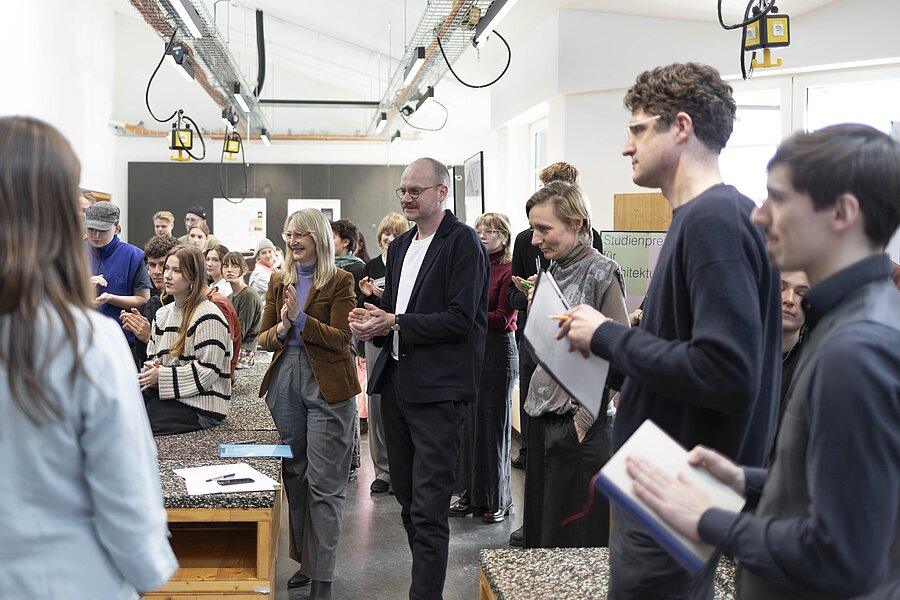 Am Vortag der Preisverleihung wurden einer fünfköpfigen Jury insgesamt 22 Projekte in Kurzpräsentationen durch die Studierenden vorgestellt. Als externe Jurymitglieder waren Aline Hielscher (Aline Hielscher Architektur), Ines Pöschmann-Panzer (pöschmann.panzer architekten) und Johann Simons (Pasztori & Simons Architekten) an die Hochschule gekommen. Weitere Mitglieder von der HTWK Leipzig waren der Architekturstudierende George Hoffmann und der Juryvorsitzende Prof. Max Wasserkampf. „Die Jury stellte übereinstimmend fest, dass das architektonische Niveau beachtlich und die Vielfalt der Aufgabenstellungen beeindruckend ist“, bereits die Nominierungen durch die betreuenden Professorinnen und Professoren wurden somit als Würdigungen der Arbeiten verstanden.