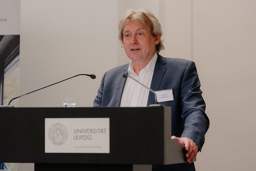 Die Auftaktveranstaltung fand in der Bibliotheca Albertina statt. Nach der Begrüßung durch die Programmgruppe wurden die Teilnehmenden durch die Kanzlerin der HTWK Leipzig, Prof.in Dr.in Swantje Rother, und den Kanzler der Universität Leipzig, Dr. Jörg Wadzack, auf die kommenden Tage eingestimmt.