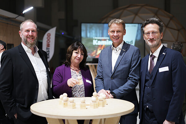 V.l.: Jan Opitz von der Metropolregion Mitteldeutschland, Gesine Sommer vom Amt für Wirtschaftsförderung Leipzig, HTWK-Professor Alexander Stahr und HTWK-Rektor Prof. Jean-Alexander Müller (Foto: Hannes Löschke/HTWK Leipzig) vom 30. Oktober 2025 Zukunftstechnologie Holzbau – Wissenschaft, Wirtschaft und Politik im Dialog Rückblick auf den ersten Parlamentarischen Kaminabend im HolzBauForschungsZentrum der HTWK Leipzig am 28. Oktober 2025 mehr Informationen