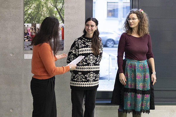 Die Eröffnung am 25. November 2025 bildete den thematischen Auftakt. Unter dem Motto „Hinschauen, zuhören, ins Gespräch kommen“ kamen Gäste aus Hochschule, Kooperationsnetzwerken und Zivilgesellschaft zusammen. Die Berliner Fotografin Anne Stolmár und die Leipziger Künstlerin Arzu Cornelia Tarhan widmen sich in ihren Arbeiten den sichtbaren und unsichtbaren Spuren von Gewalt – und schaffen Bilder, die berühren, irritieren, herausfordern und zum Weiterdenken einladen. Unsere Gäste nutzten die Gelegenheit, mit den Künstlerinnen ins Gespräch zu kommen und ihre Eindrücke zu teilen.